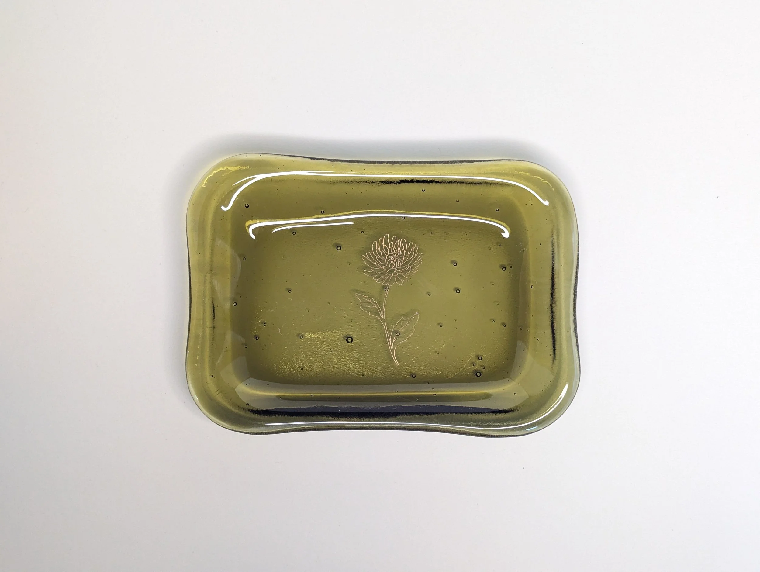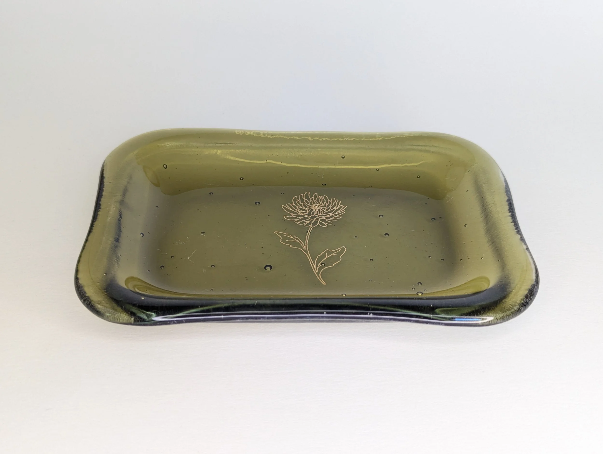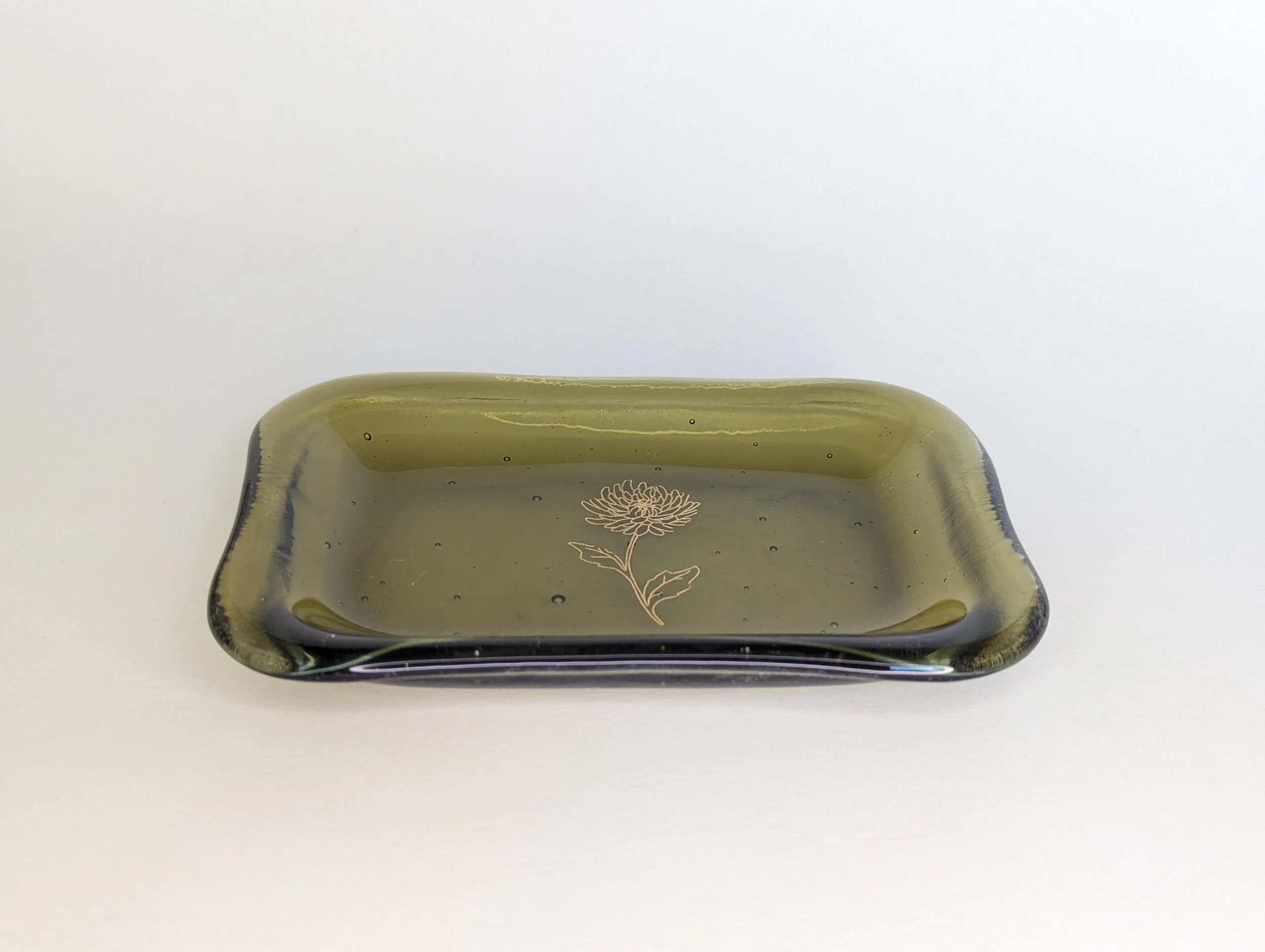 The Trinket Dish is a handmade fused glass dish in a warm light olive, adorned with a delicate gold flower. It's the perfect spot for your rings, earrings, and everyday treasures, or use it as a snack dish or catchall wherever it fits best.
